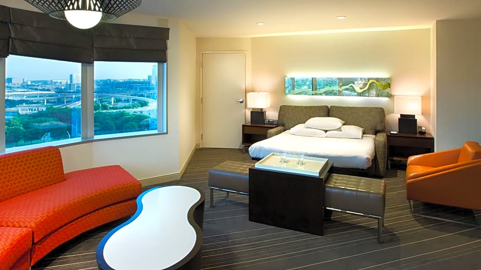This suite features a dining table, a seating area with a sofa bed, a work space, a coffee/tea maker and a refrigerator. It includes a 65-inch flat-screen TV with streaming service, an in-room safe and ironing facilities. The bathroom includes a hairdryer and Pharmacopia® all-natural bath amenities.